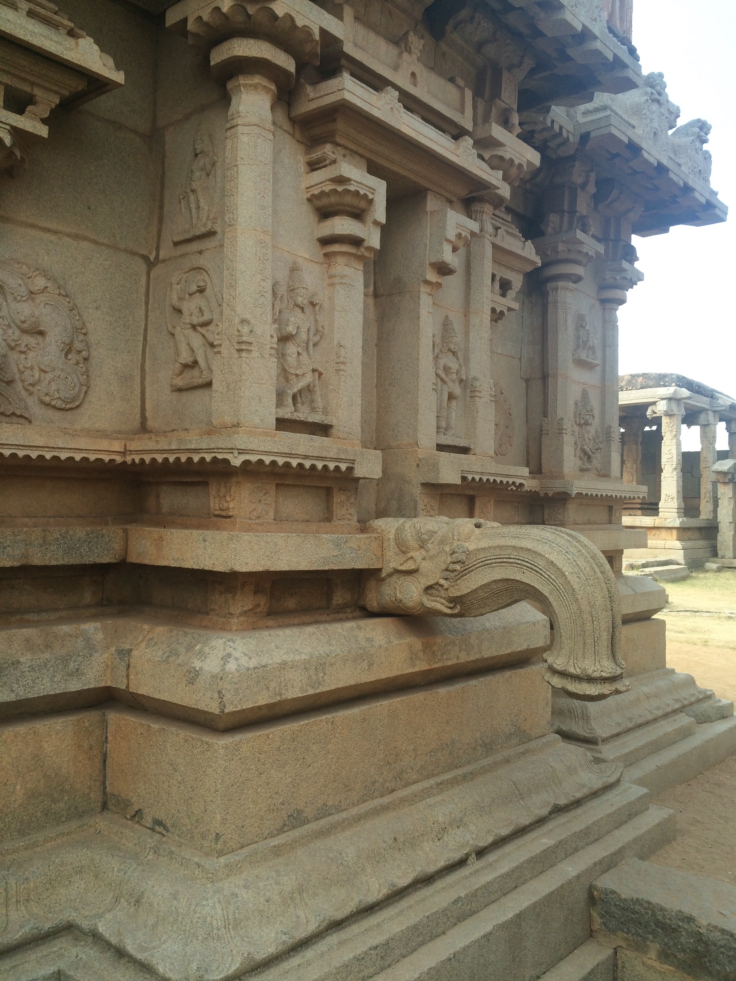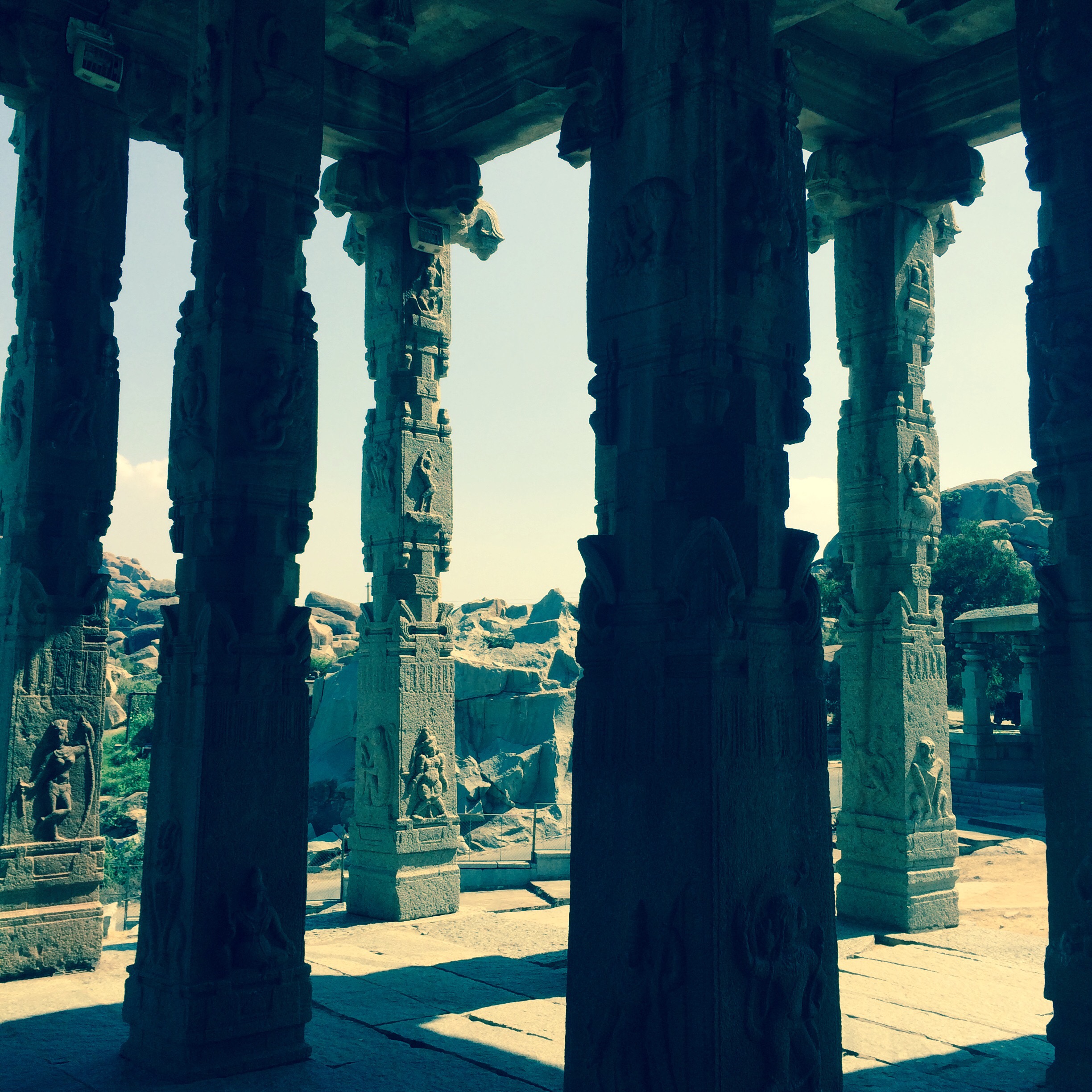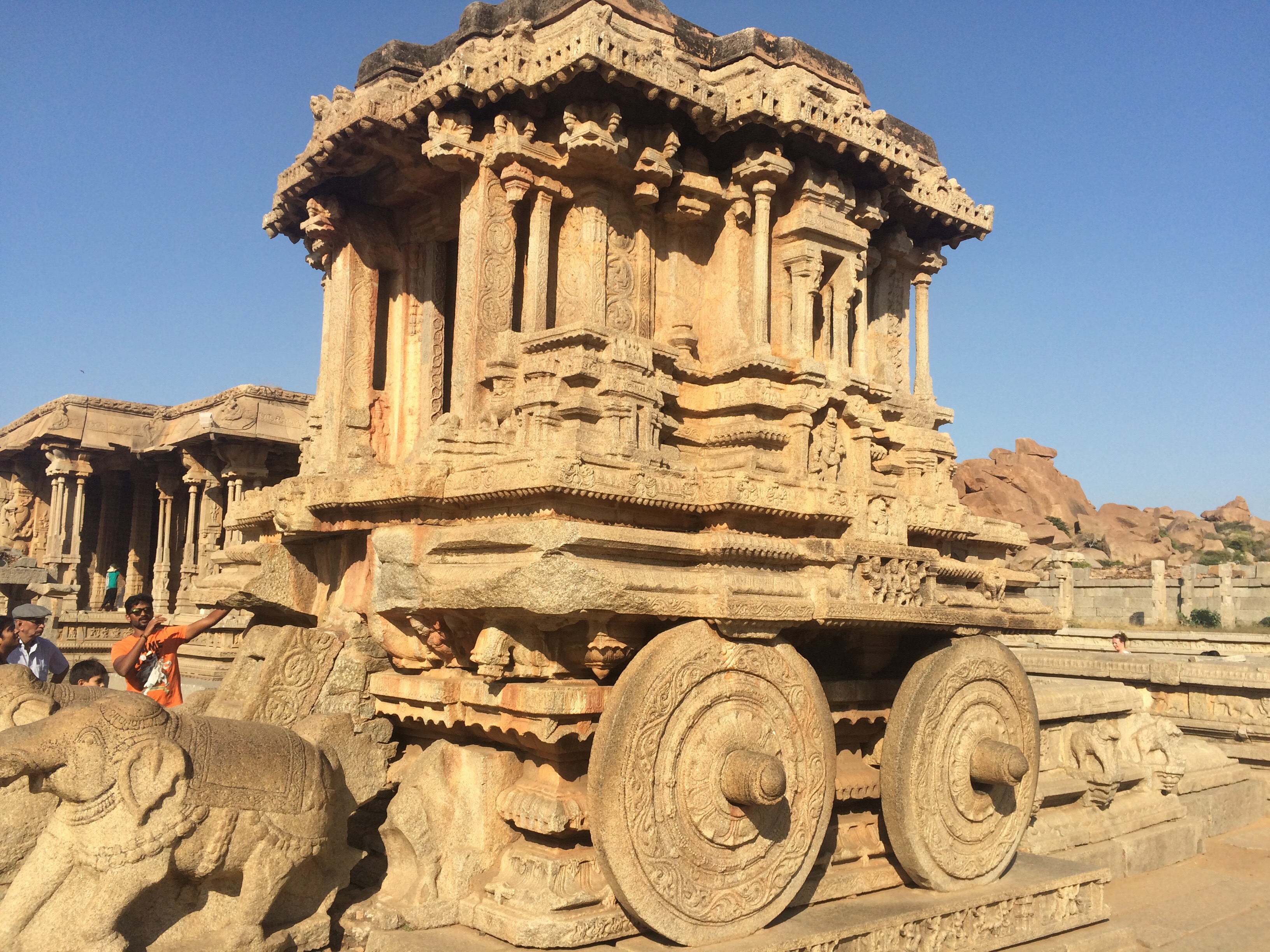 The Elephant Stone chariot, the trademark of Hampi, faces the dancing hall in the Sri Vittala Temple; its beautifully carved columns are like musical pillars that would have resonated with rhythms of the temple dancers.