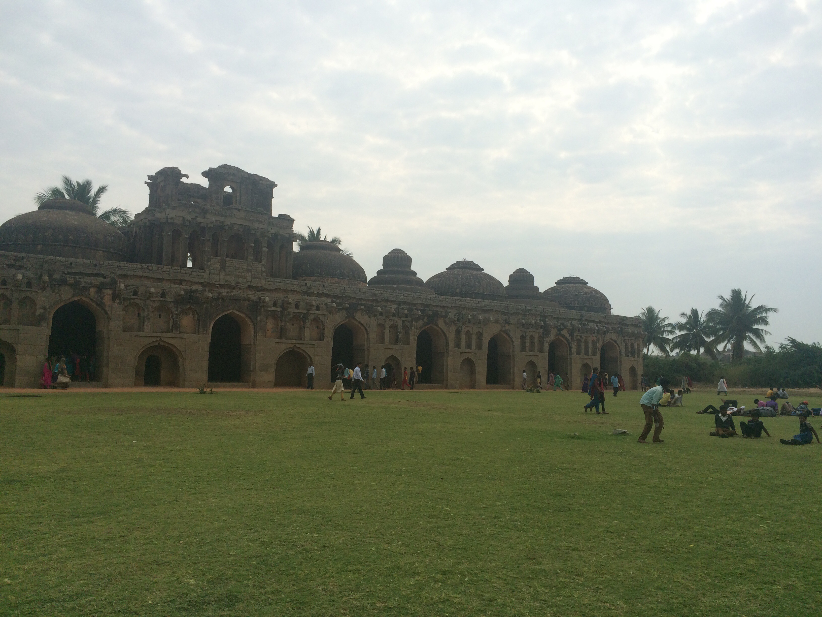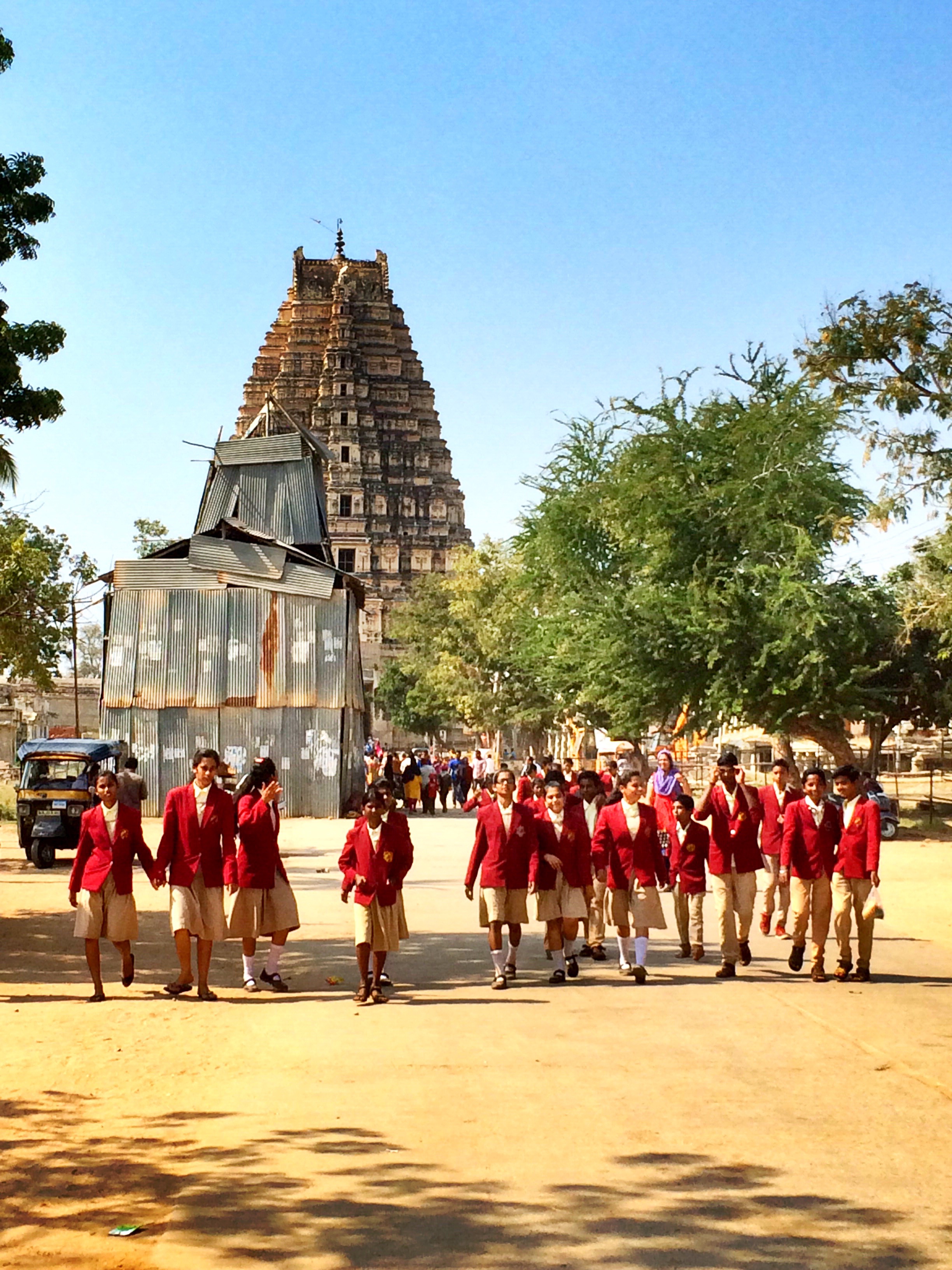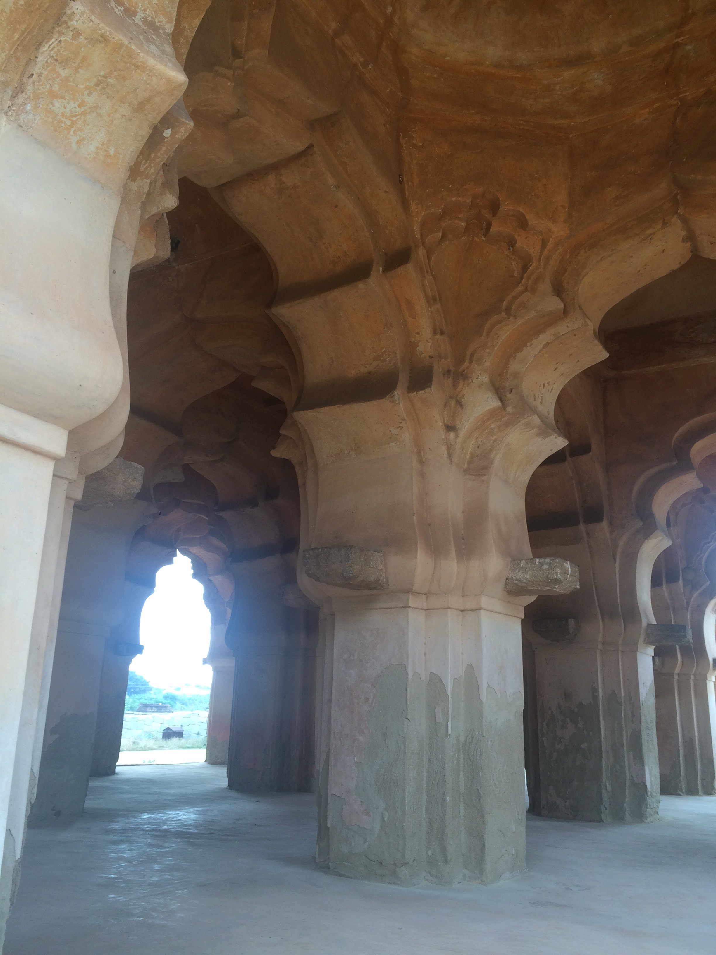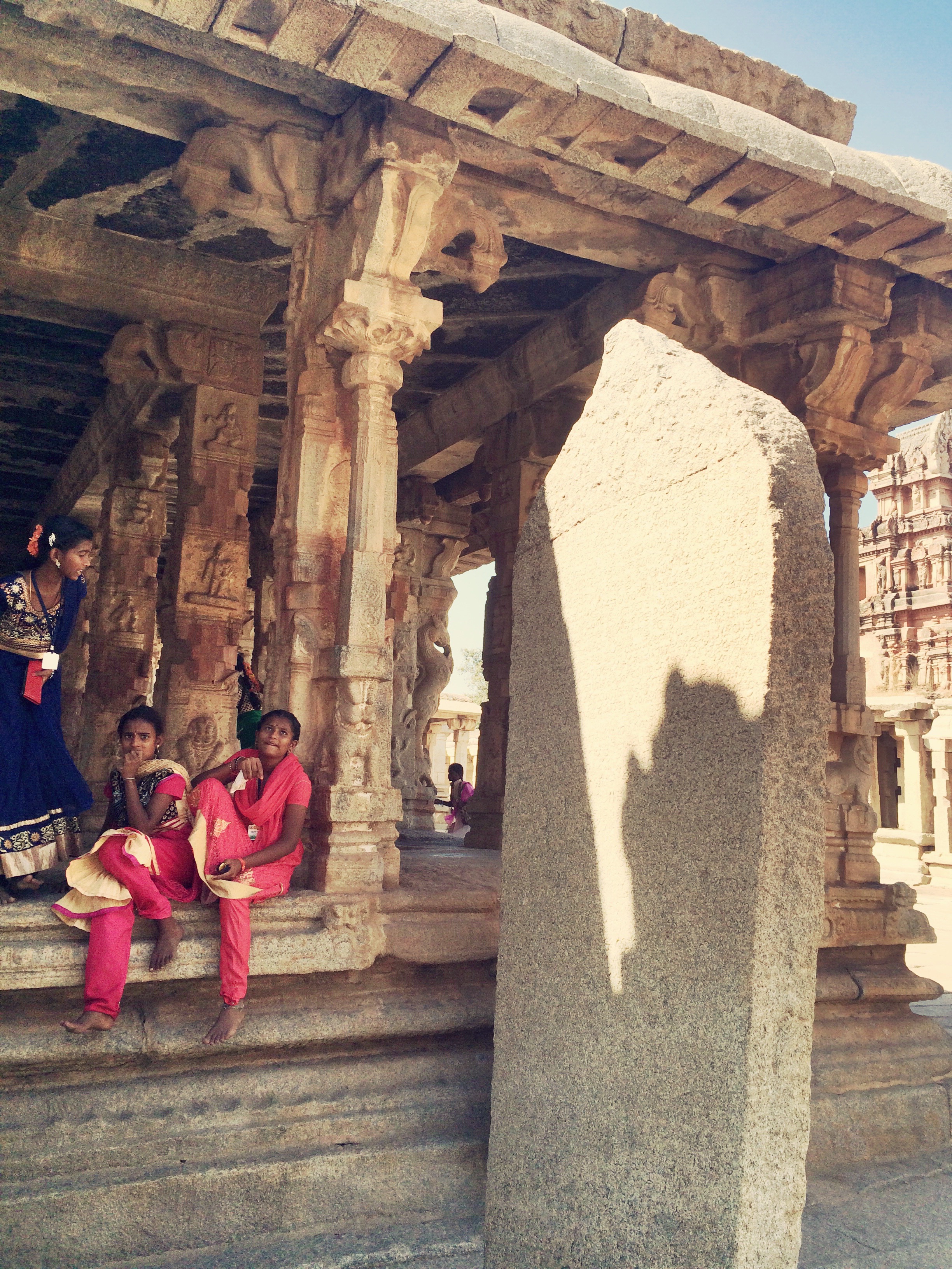 The Elephant Stone chariot, the trademark of Hampi, faces the dancing hall in the Sri Vittala Temple; its beautifully carved columns are like musical pillars that would have resonated with rhythms of the temple dancers.