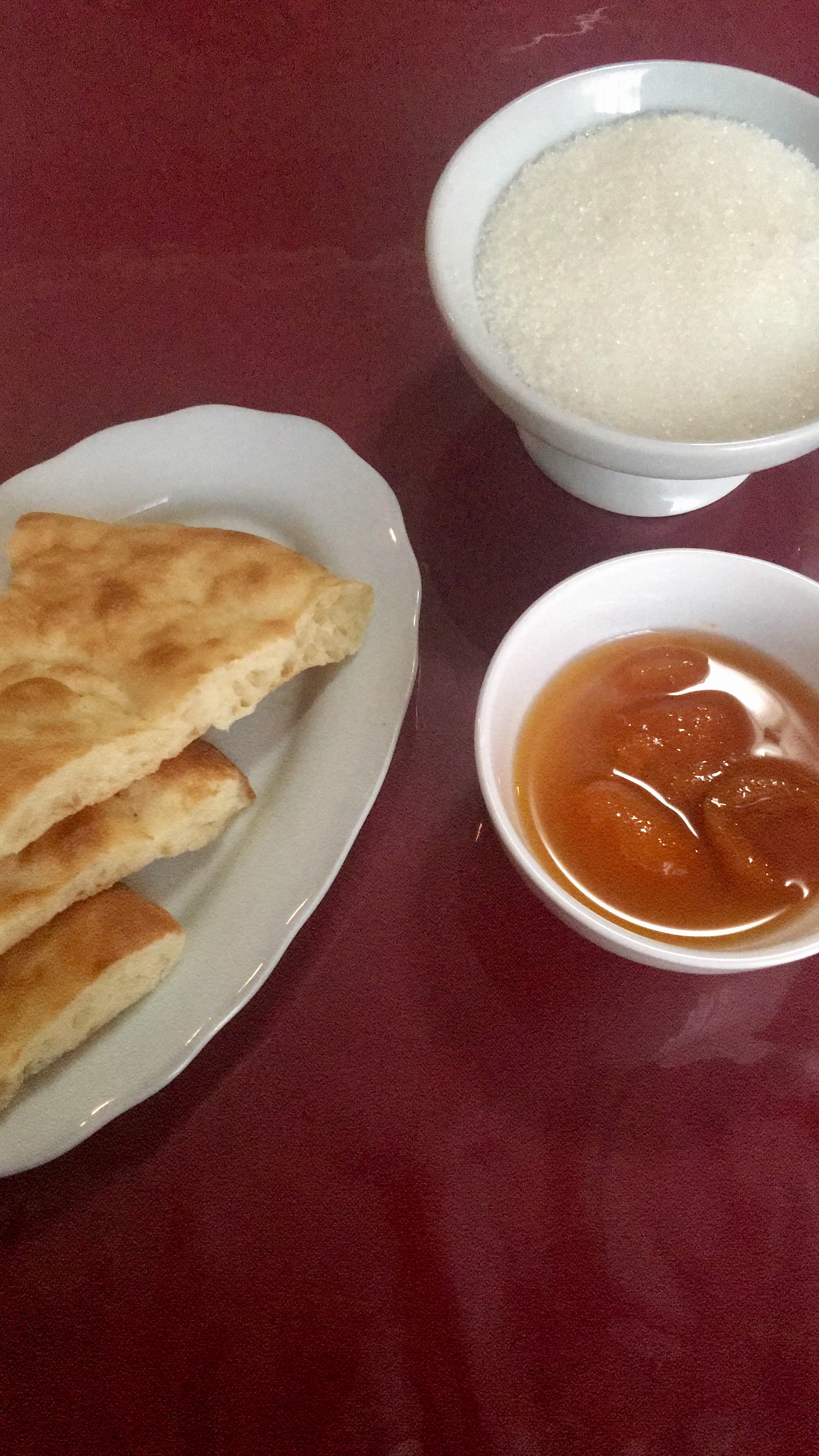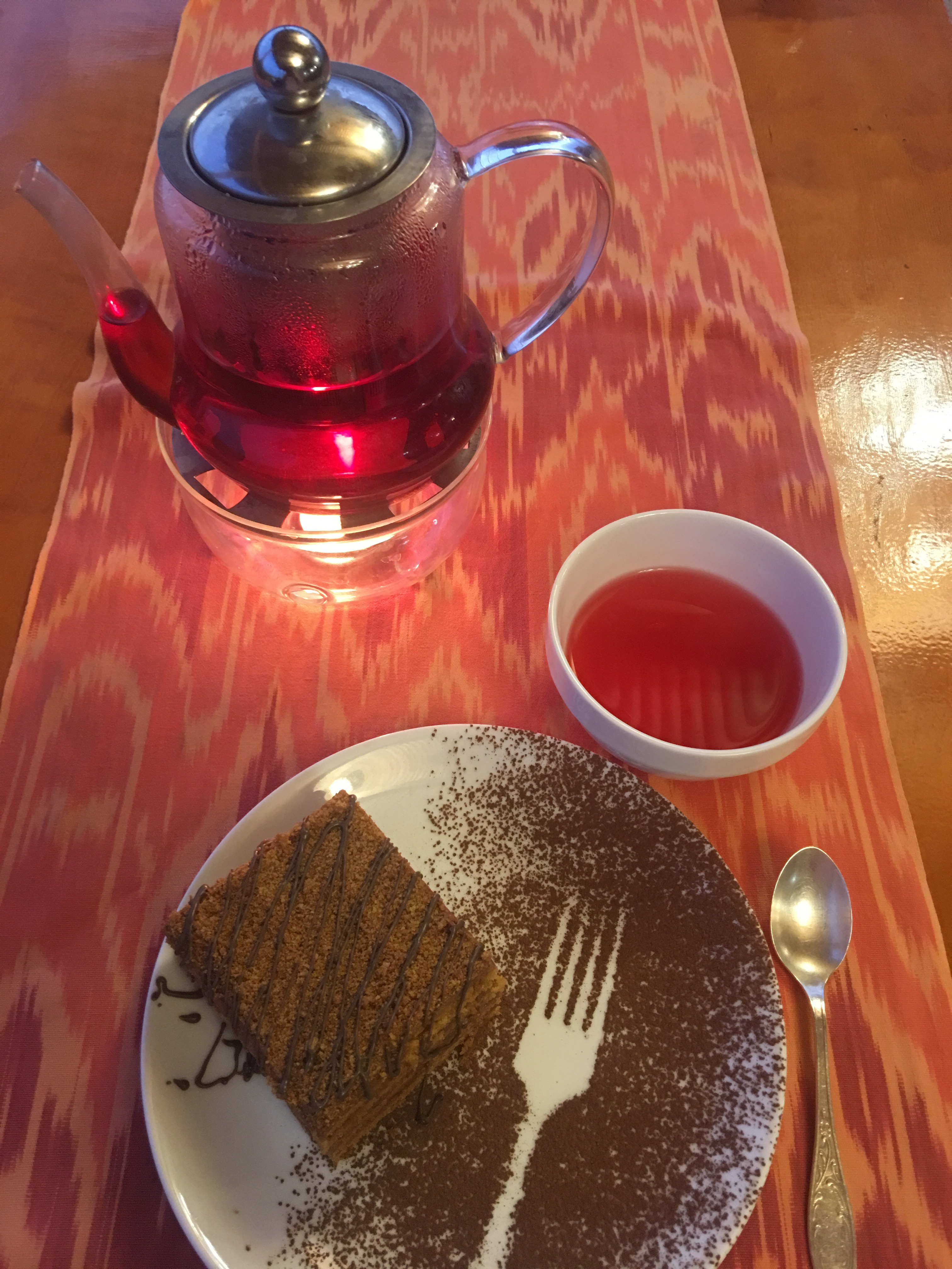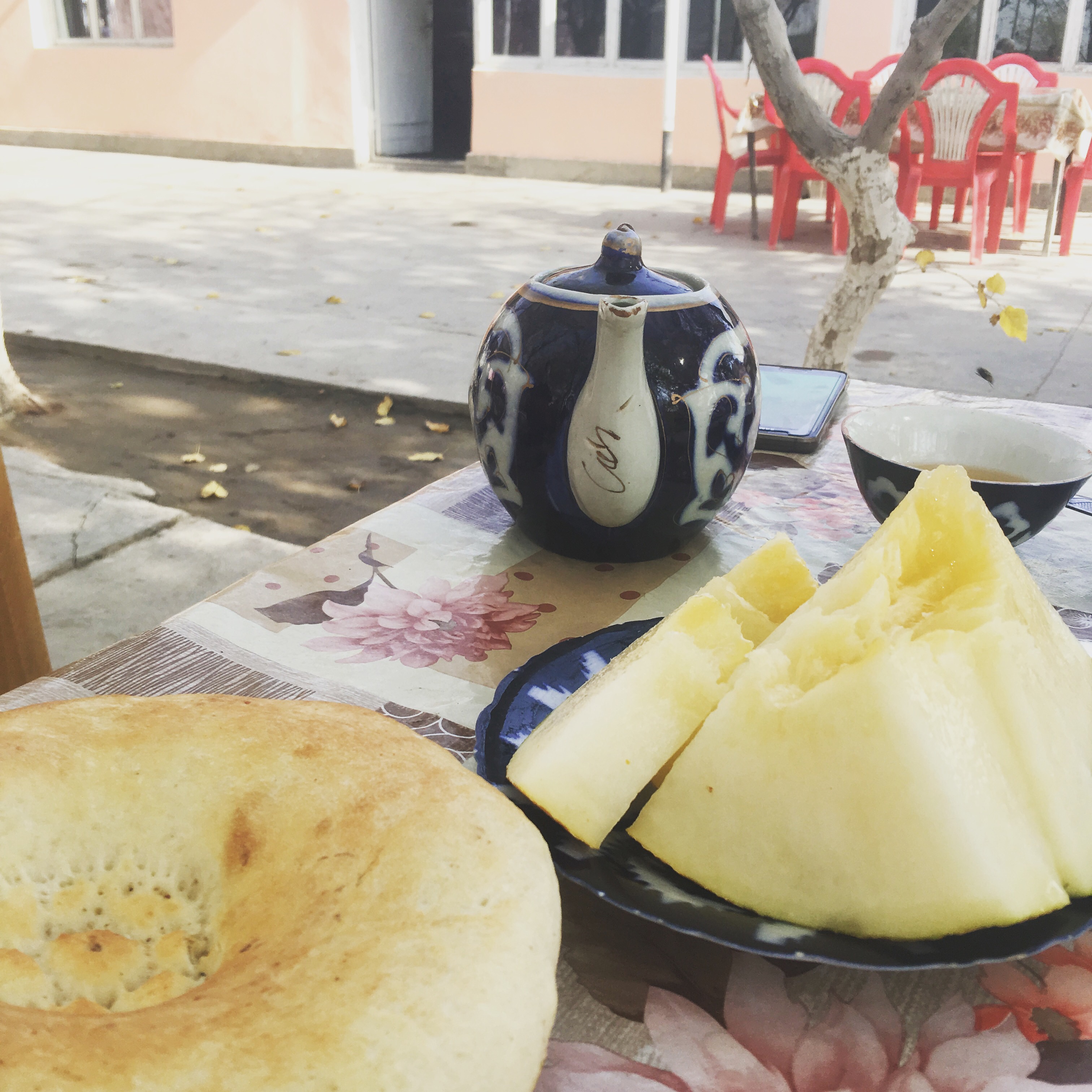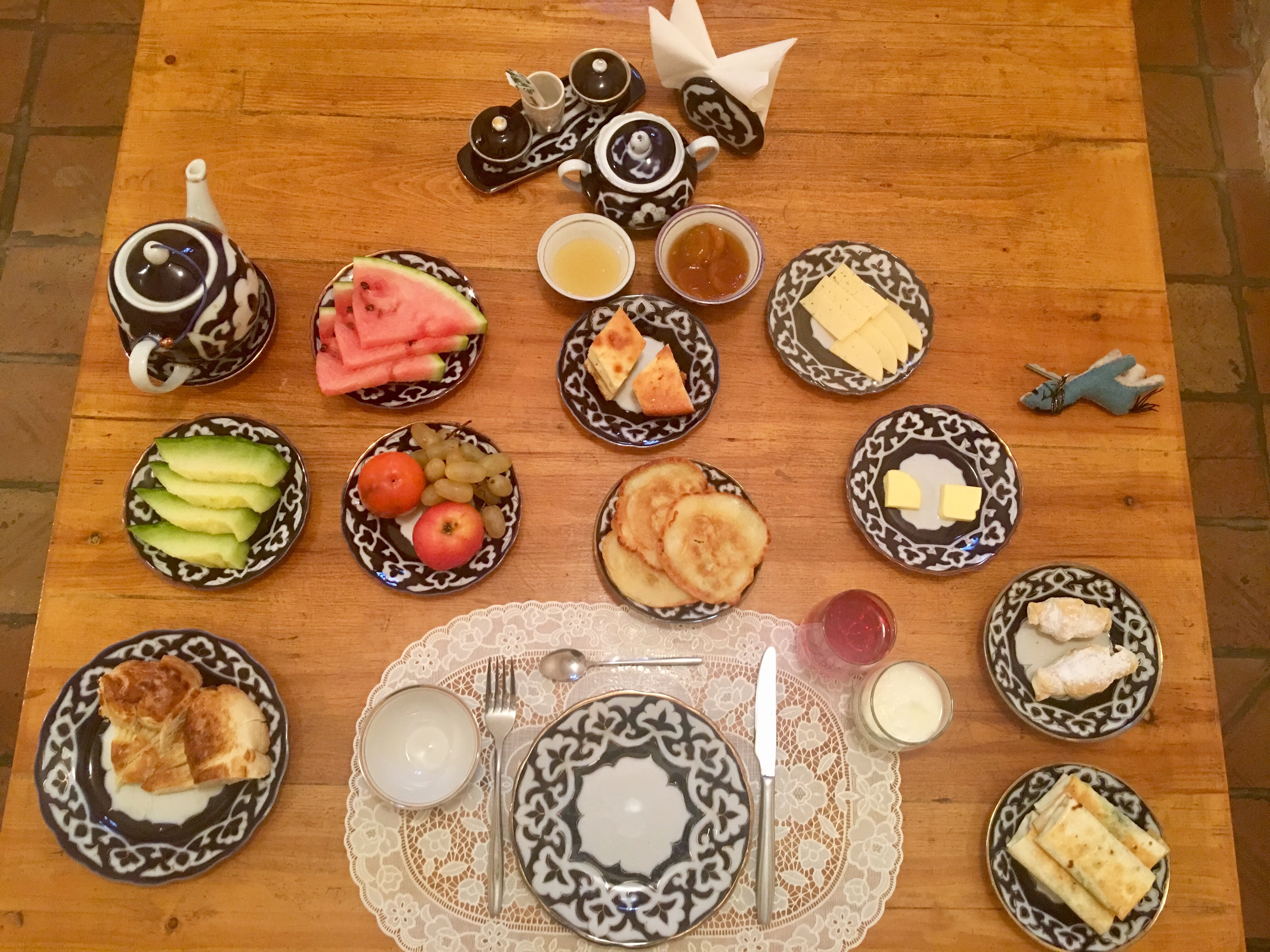 The breakfast was lavish. Breads, Uzbeki pastries, sweet melons, potato latkes, yogurt, cheese, honey, pancake, jams, tea, coffee and juice.