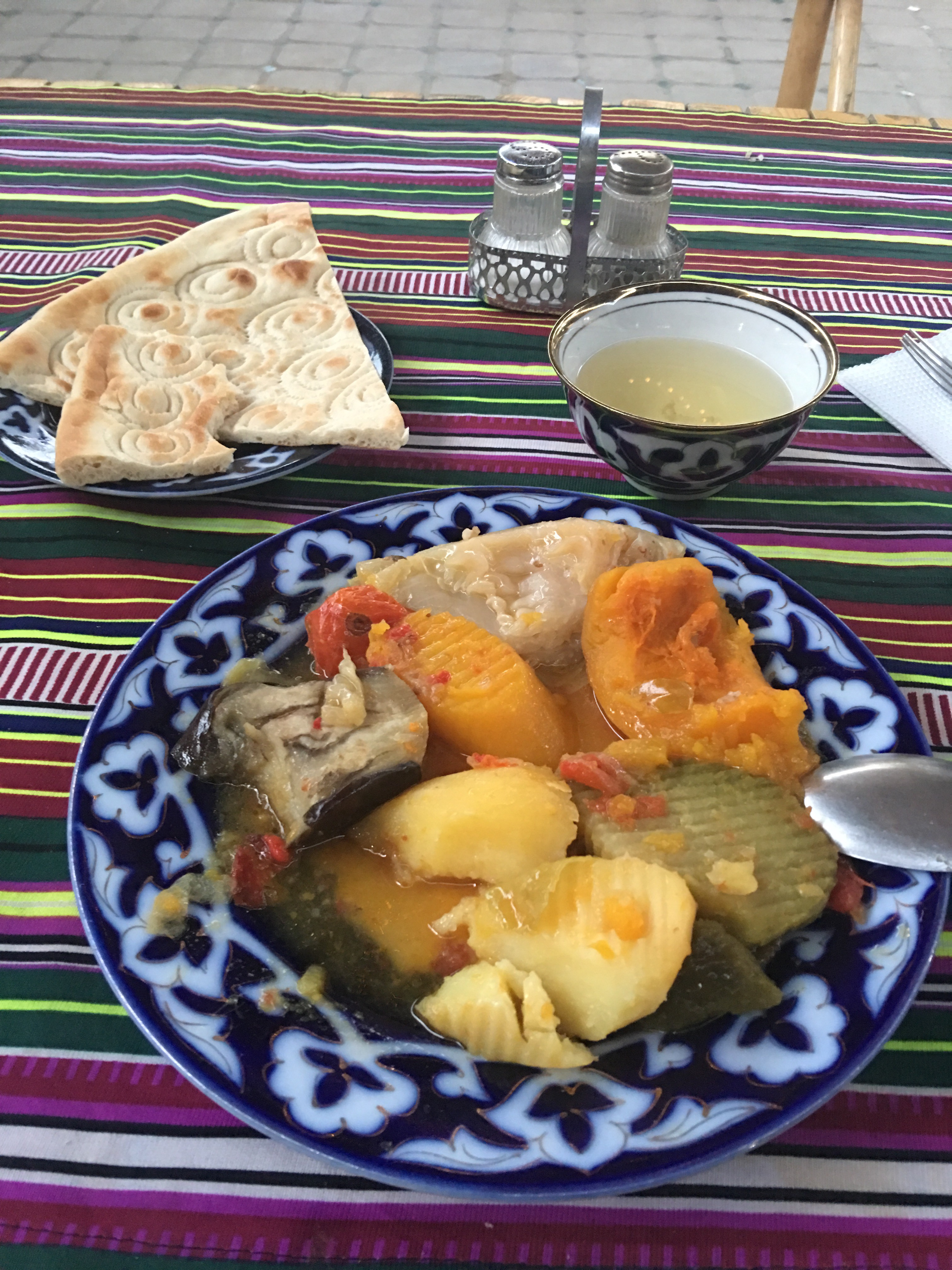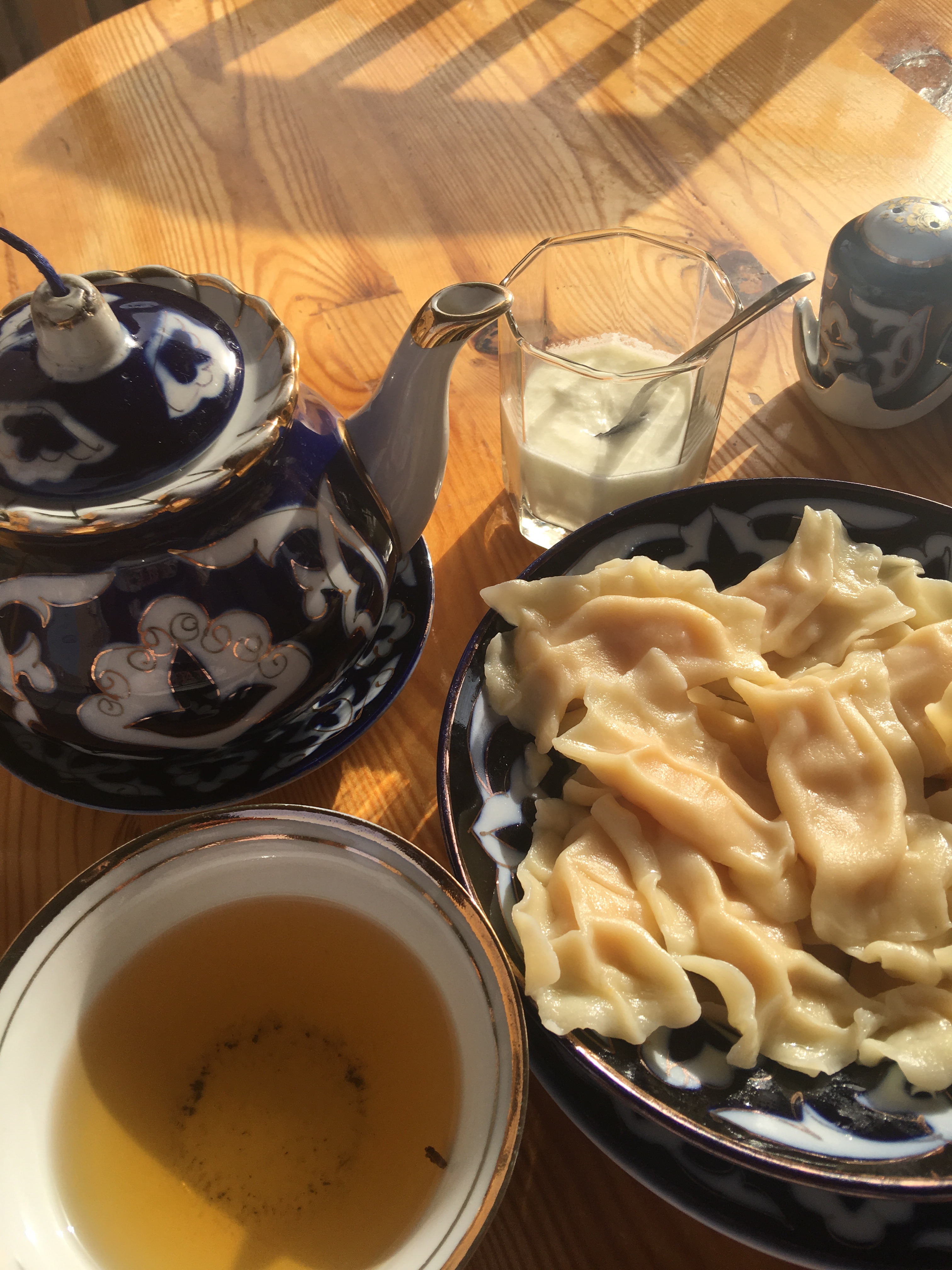 In Khiva, I tried a variety of dishes. Dimlyama is a stew of garden vegetables typically cooked with lamb though mine was vegetarian consumed with a pot of tea and naan. Manti is like ravioli. It comes with a variety of fillings, predominantly meat. Mine was with pumpkin.