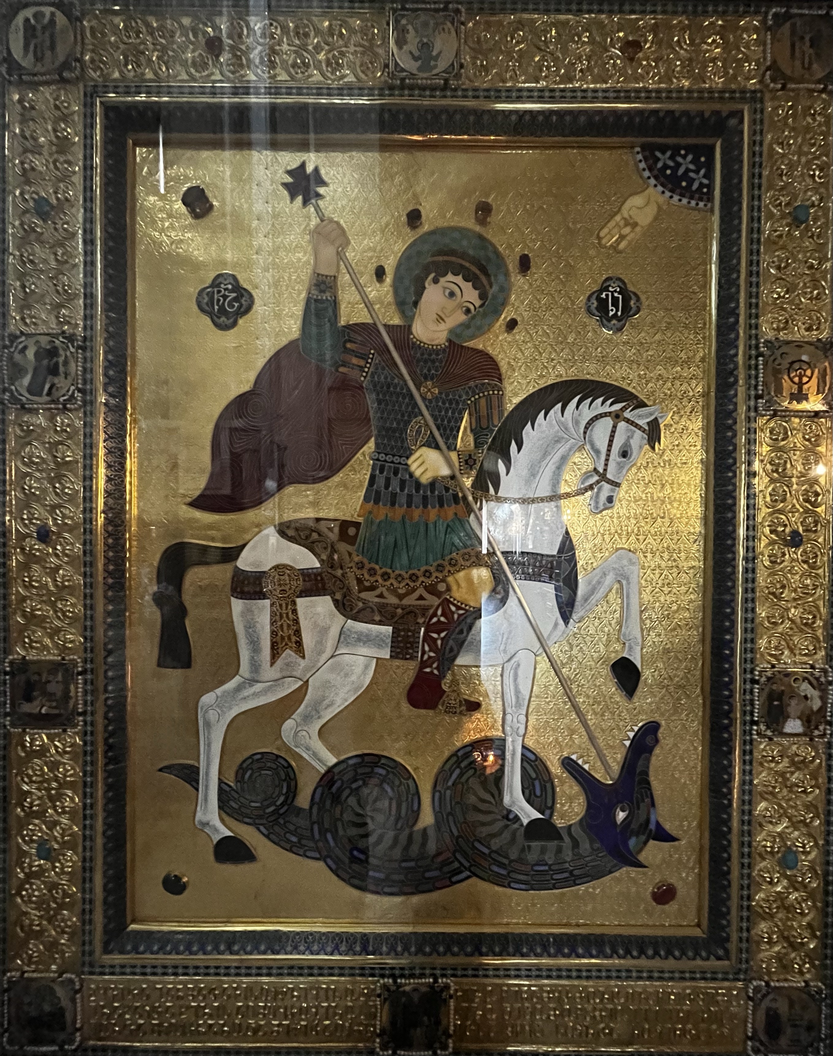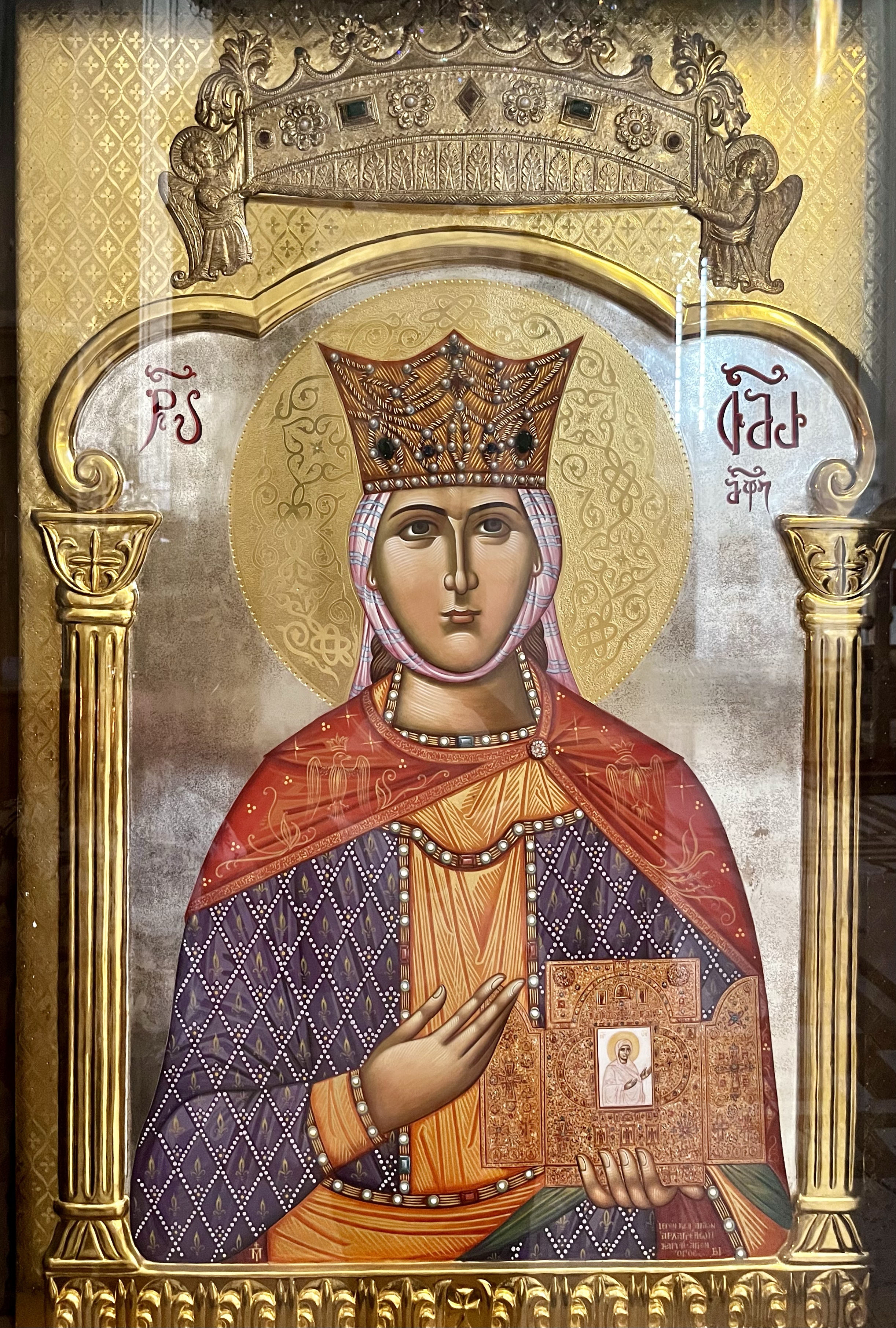 Saint Nino is revered for bringing the grapevine cross, a symbol of Georgian Orthodox Church to Mtskheta, the former capital of Georgia. Queen Tamar is an important figure in Georgia who ruled during its Golden Age and likened to Queen Elizabeth. Mother Mary is of course most revered as per the Orthodox Christian faith.