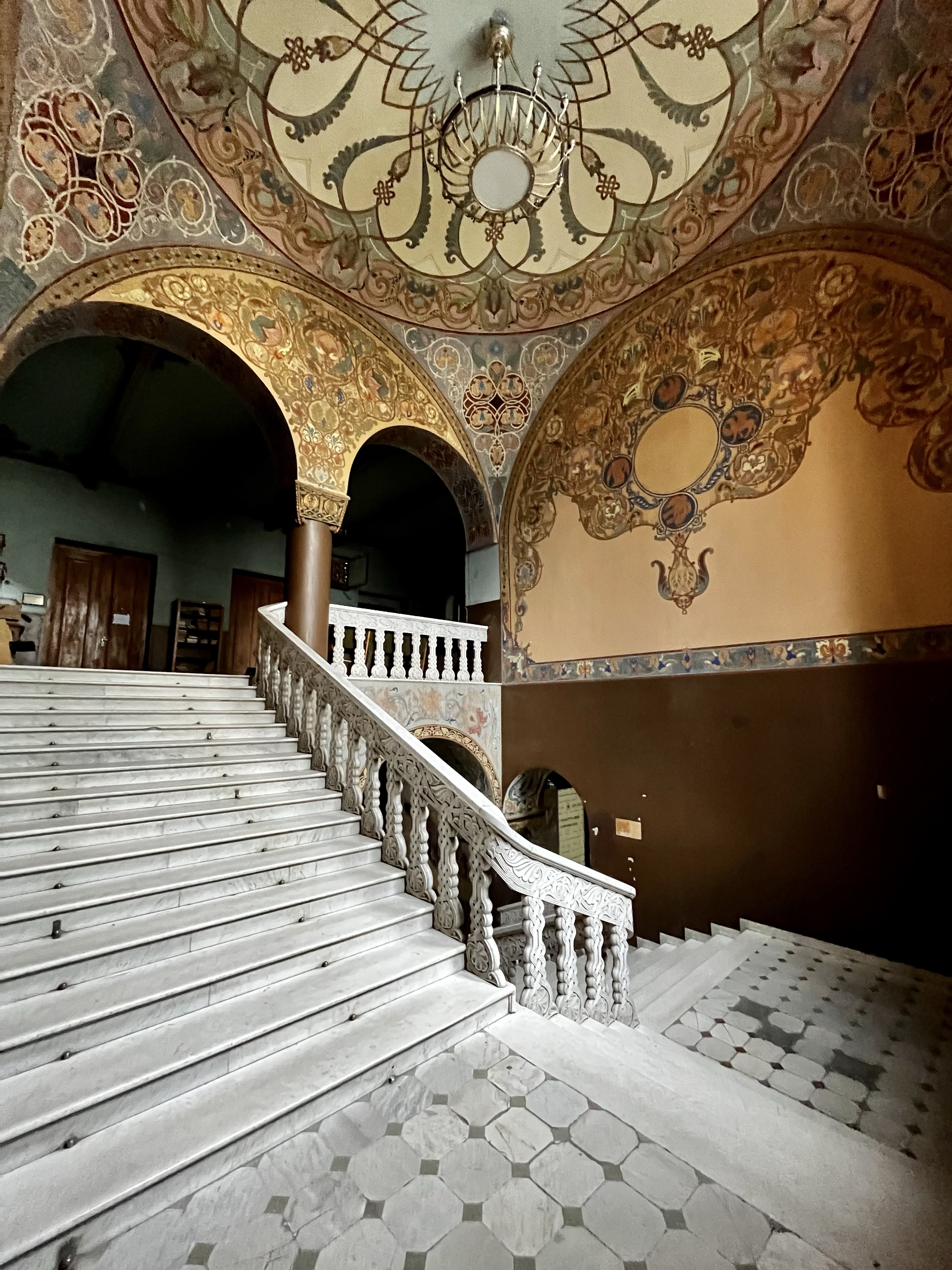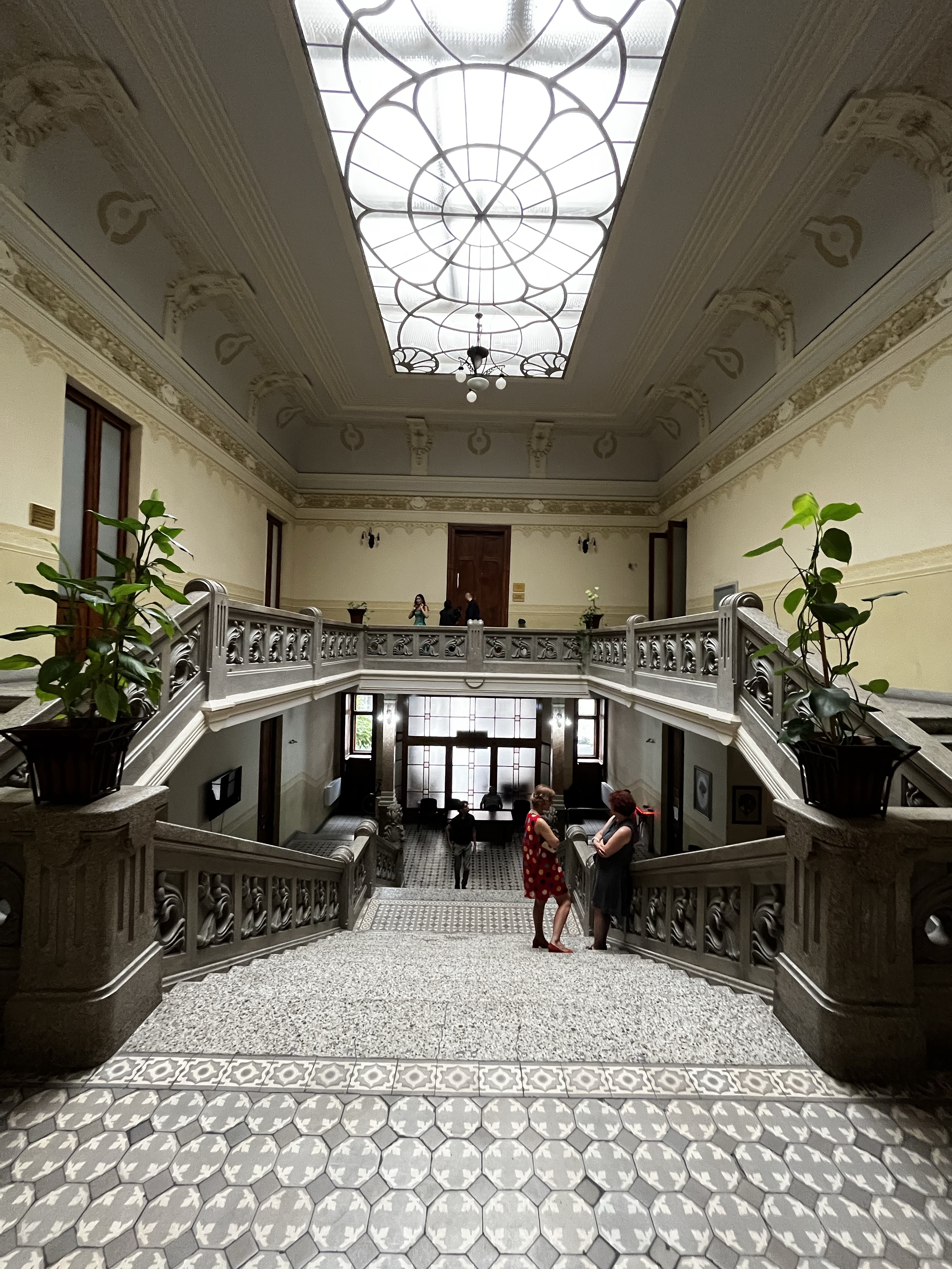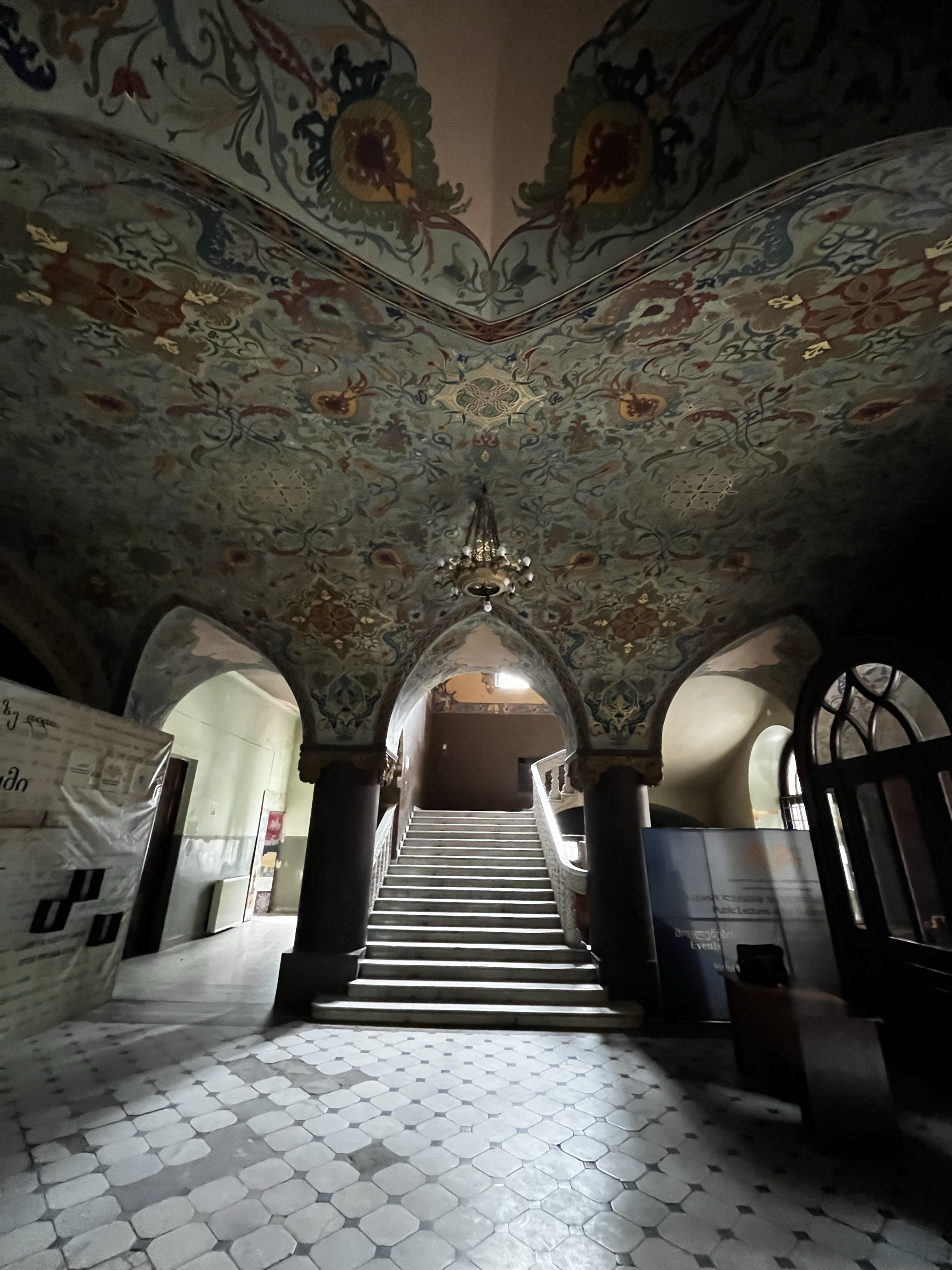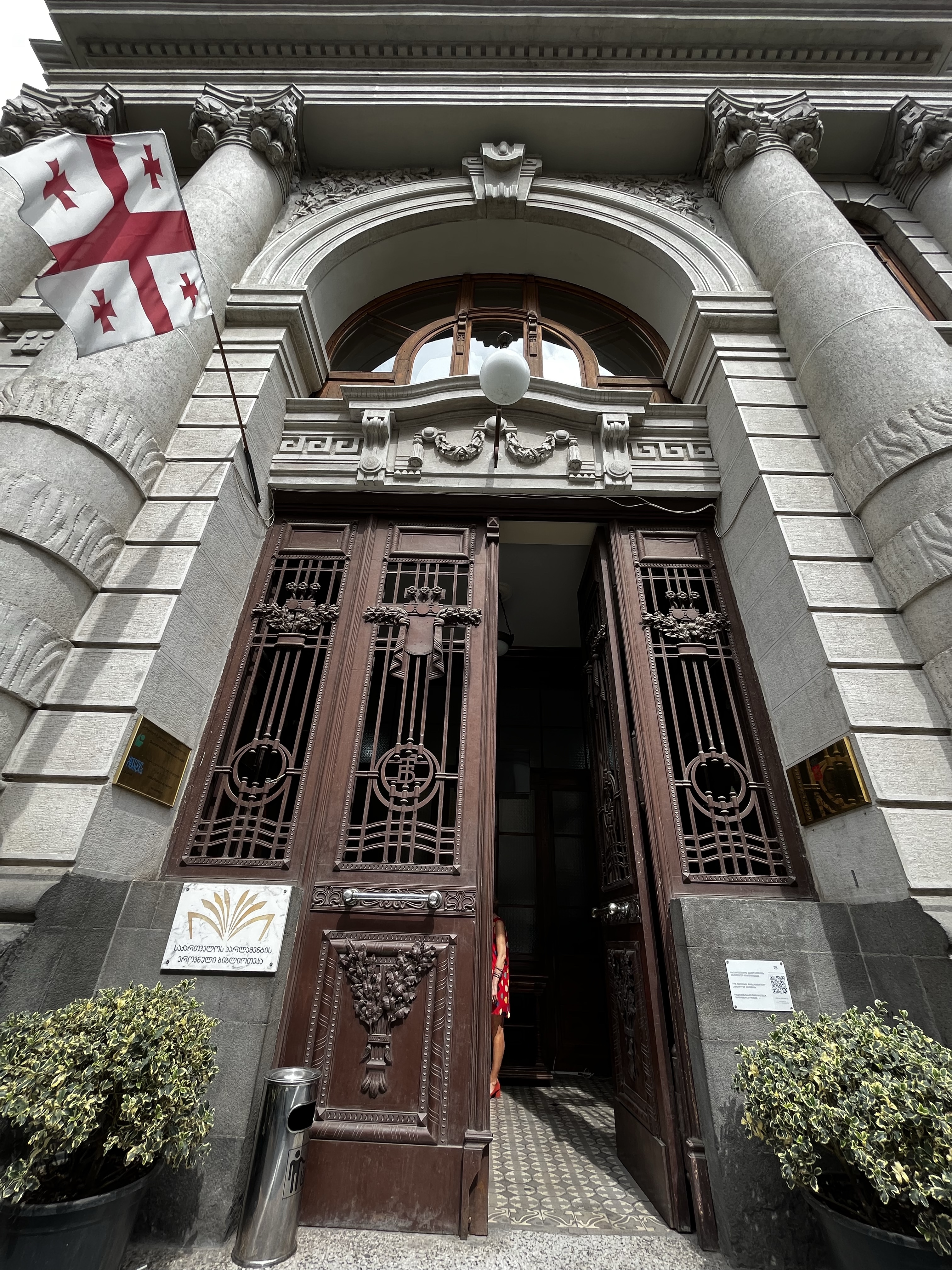 Formerly the office of the State Bank the Art Nouveau building (called Modern Style in Georgia), was designed by architect, Micheil Ohanjanov and built in 1910. The interiors incorporated iron and glass to let in the light, curving lines that emulated the movement and forms of vines and leaves, at the same time adding Neo-classical and Palladian touches from Greek and Roman temples.