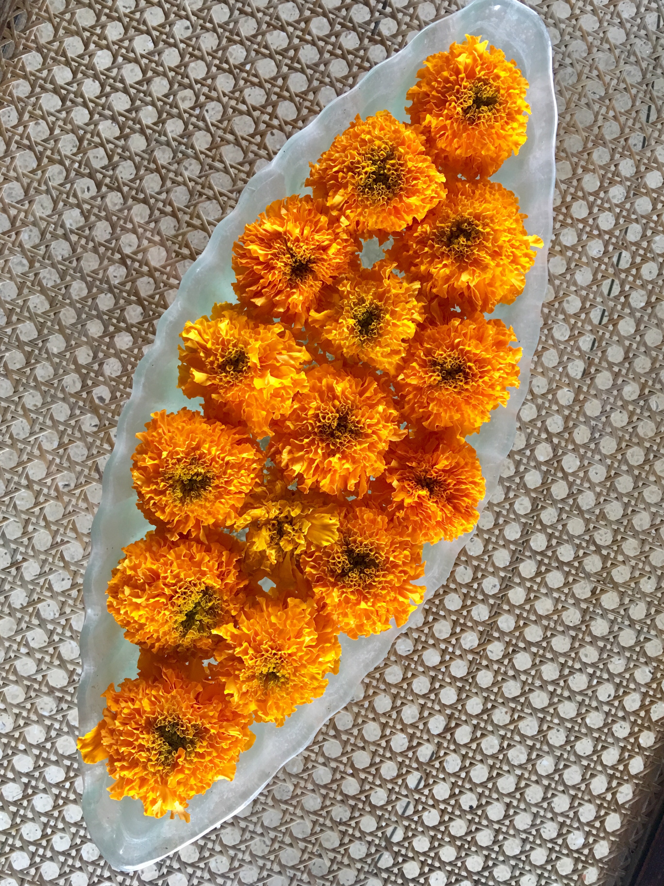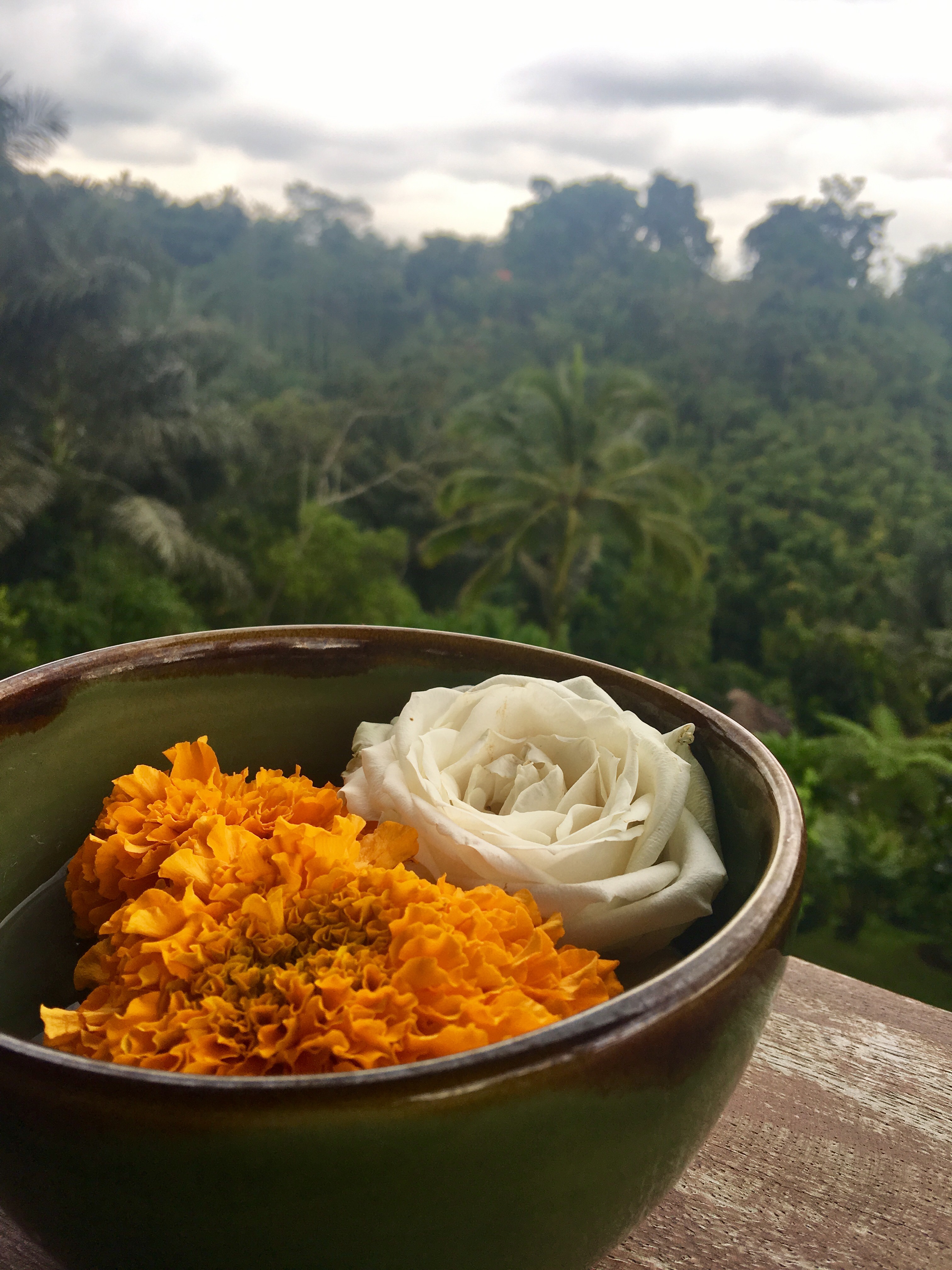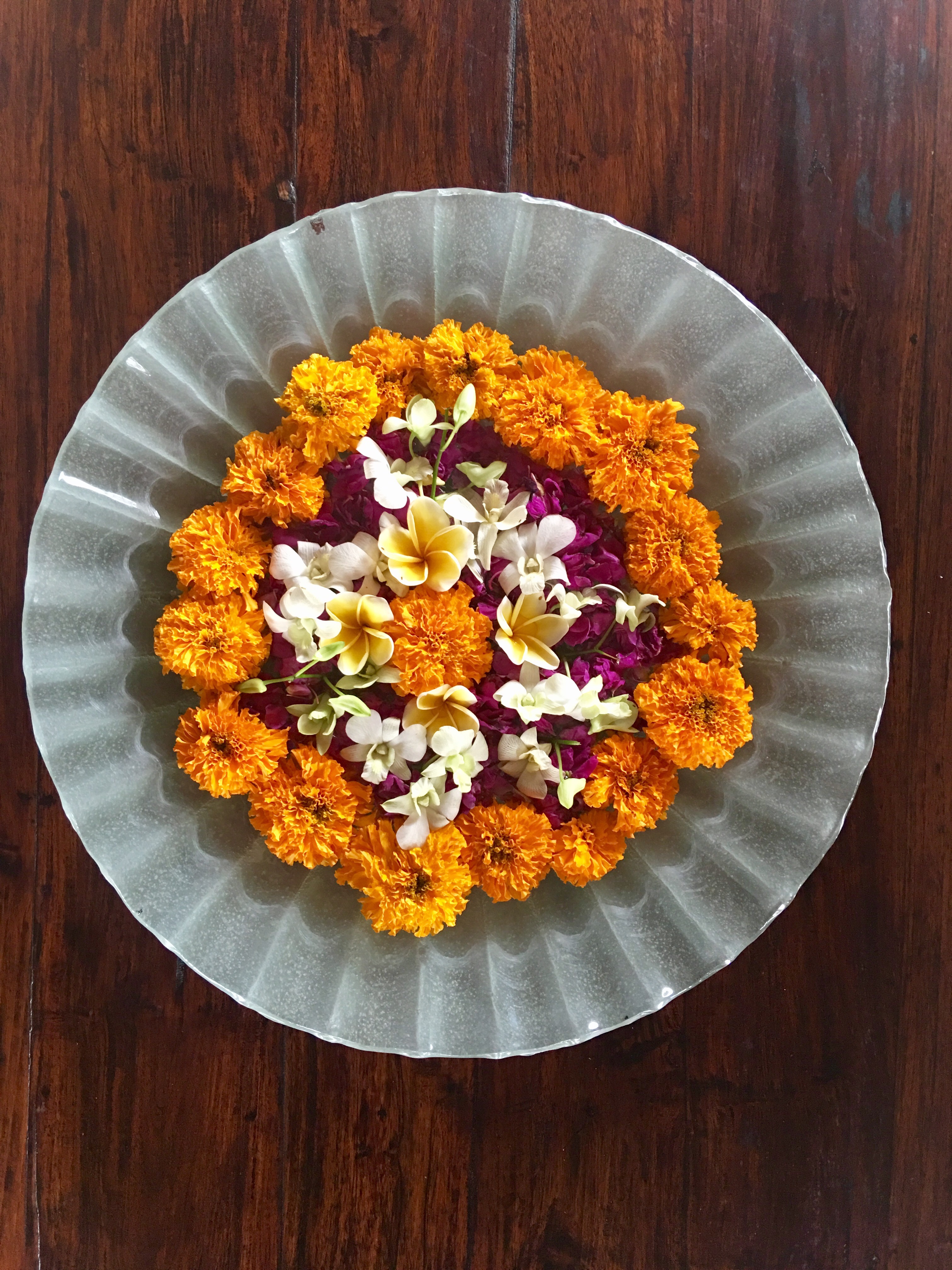 In hotels and in temples, I saw marigold and frangipanni flowers decorated in bowls. The colour white is for purity and gold for abundance.